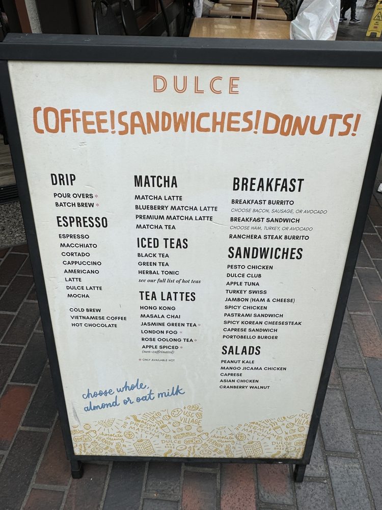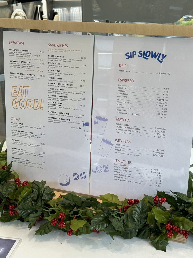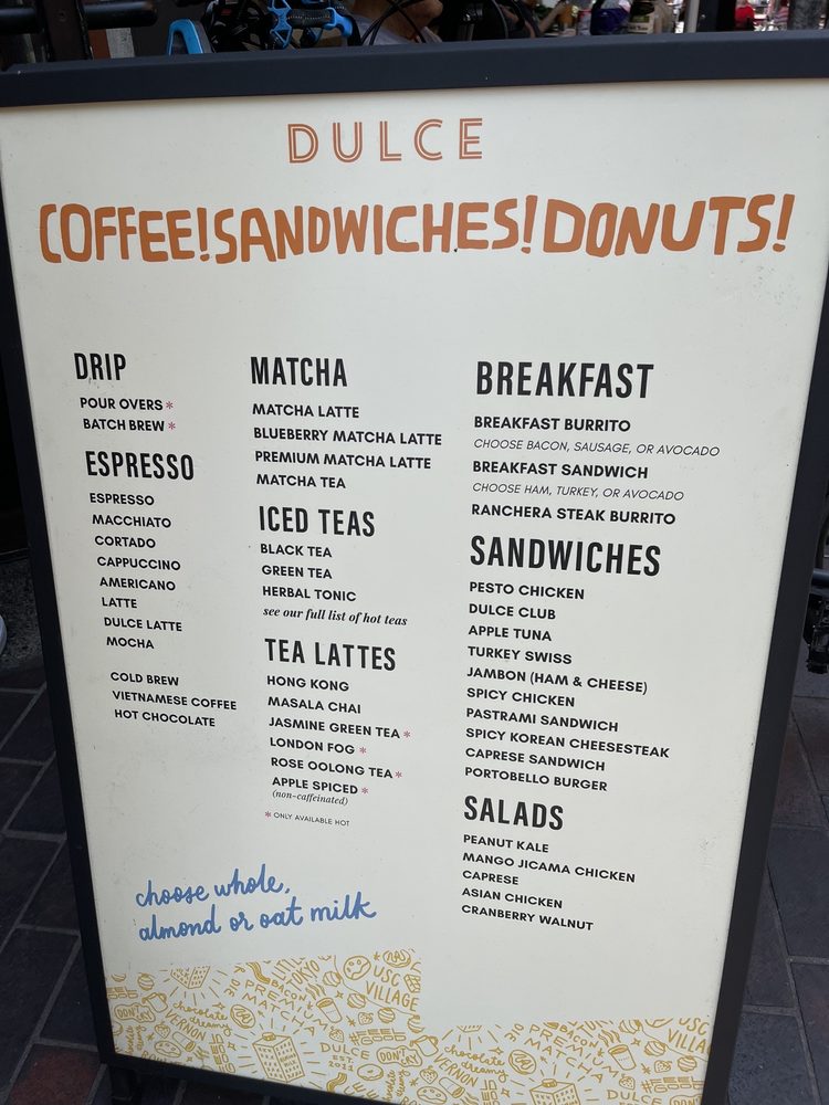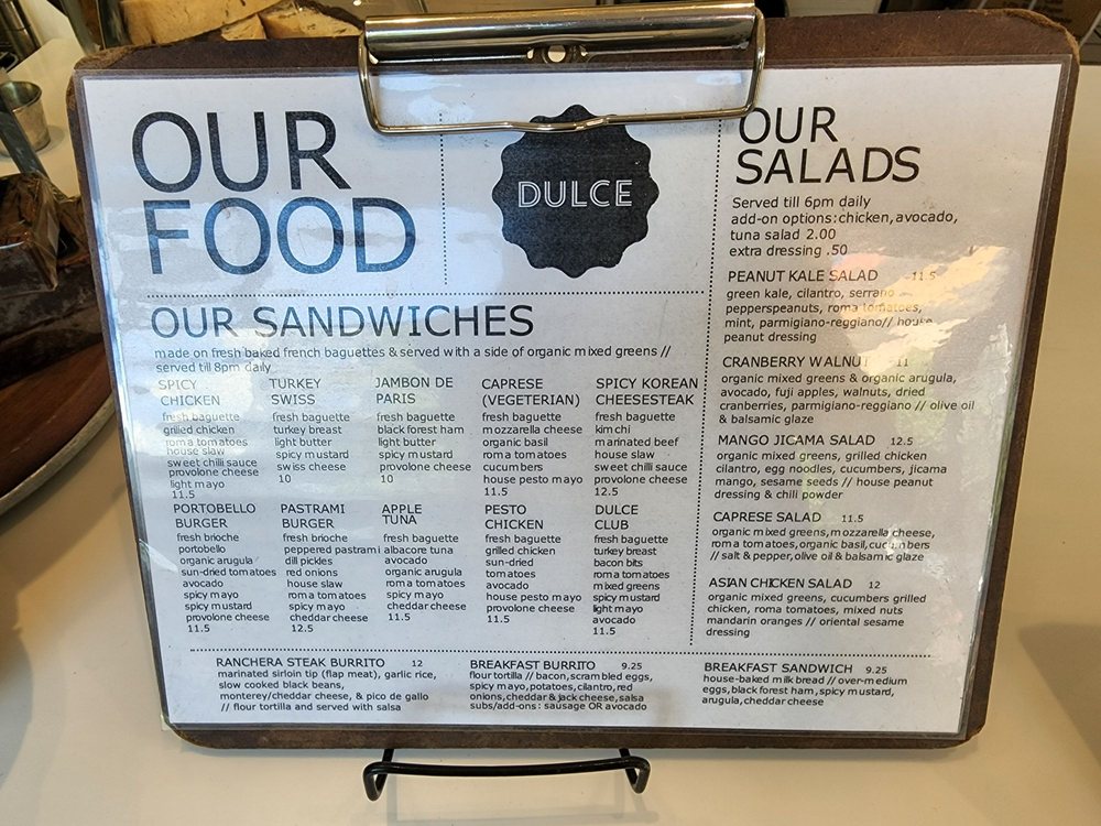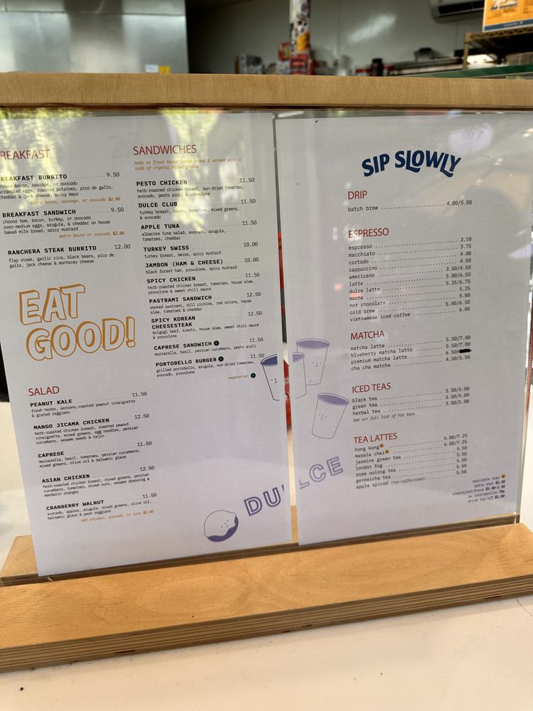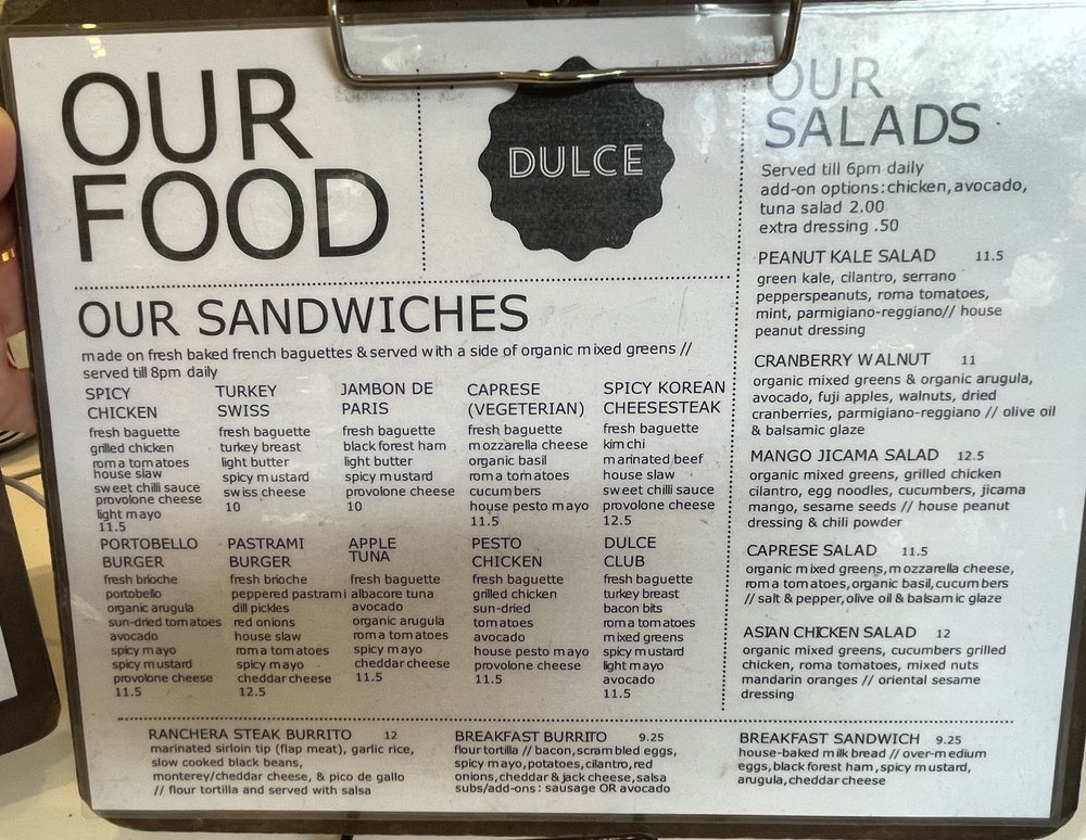 Introducing the menu at Cafe Dulce located in Los Angeles, this bakery-cafe offers an array of delectable options. From the savory Ranchera Steak Burrito to the fresh Caprese salad, there's something for everyone. The Dulce Club sandwich and Pesto Chicken sandwich are sure to satisfy any craving. For breakfast, try the unique Peanut Kale Salad or the refreshing Cranberry Walnut salad. Customers rave about the blueberry matcha latte and the Vietnamese coffee, perfect for a morning pick-me-up. The outdoor seating and prompt service make it a great spot to relax with friends. With a variety of pastries and baked goods to choose from, Cafe Dulce is a must-visit spot for food enthusiasts looking for quality and flavor.